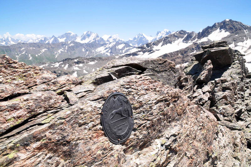 Gipfel-Plakette: Der Felsentiger-Gipfel bietet einen faszinierenden Rundumblick, im Süden auf die 4000er der Hauptkette des Kaukasus, gleichzeitig Grenze zu Georgien und deshalb Sperrgebiet.