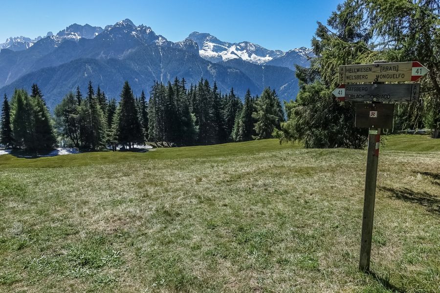 Von den Hellwiesen, kurz vor dem Abstieg nach Toblach, bietet sich ein freier Ausblick auf die Pragser Dolomiten.