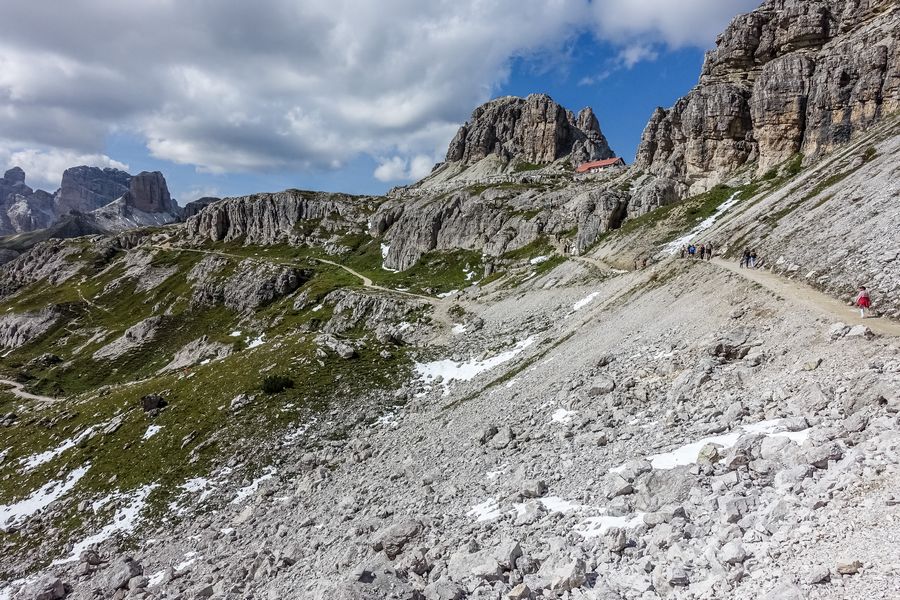 Der Weg zwischen Drei-Zinnen-Hütte und Paternsattel dürfte einer der meistbegangenen Wanderwege der Alpen sein.