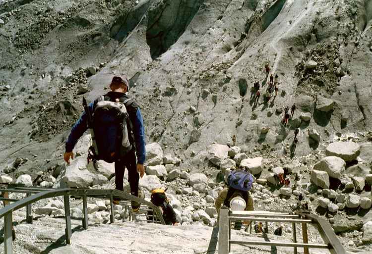 und steigen über lange Leitern hinab zum Mere de Glace. Bergführer